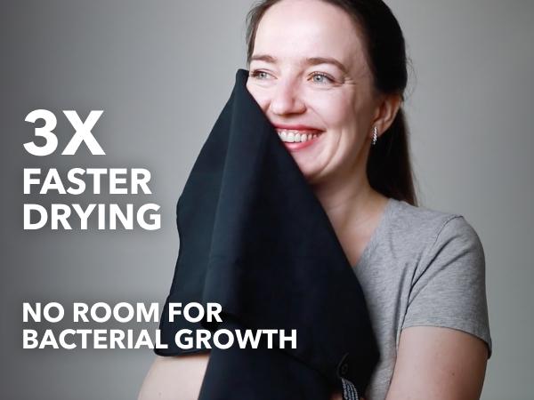 - BACTERIA-FREE DRYING - The microfiber material is thin and dries up to three times faster than traditional towels. Moisture evaporates rapidly, ensuring a bacteria-free towel, so you always have a fresh one for your skin.